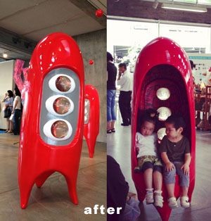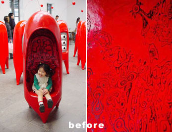 ポルチコポピリンの背中をくりぬいて座ることができる椅子型オブジェ。