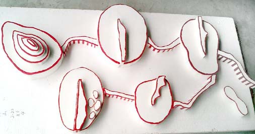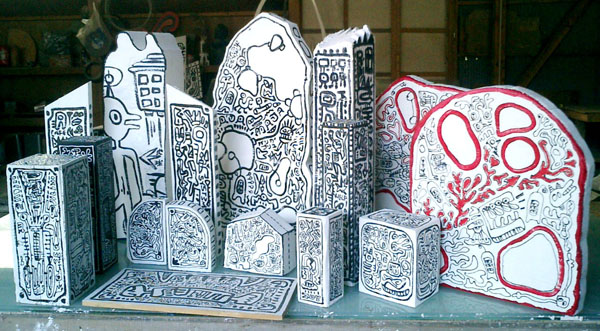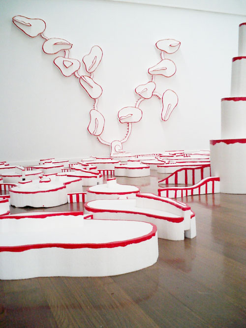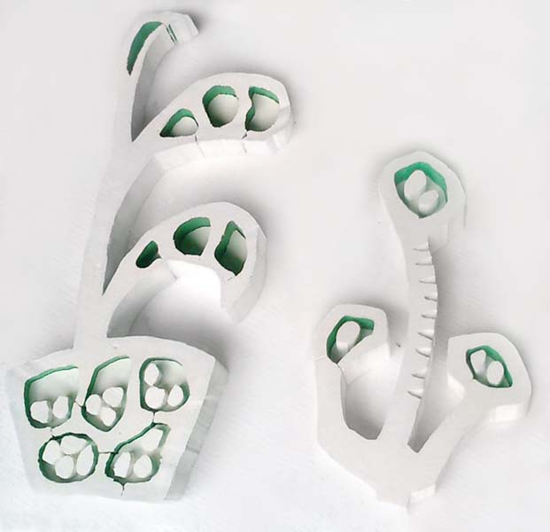 発泡スチロールは加工がしやすくじゃんじゃん作れるので好きな素材の一つだ。 スケッチブックにドローイングするような感覚で手を動かせる。カットした後の 破片から新しいものが生まれたりもする。もう一つ好きな点は、人工物で真っ白 なところ。錆や木片など古びたものも魅力的だけど、時にその風合いの持つ力が 強すぎて、それに惑わされてしまうことがある。その対極でもある発泡スチロー ルは、すんなり私のイメージを受け入れてくれる。