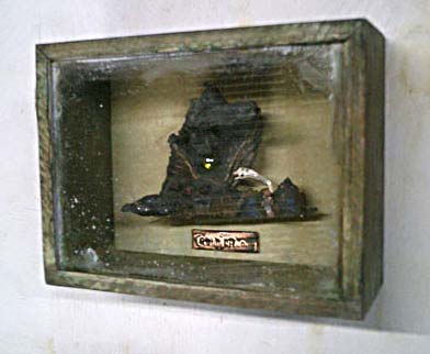 「箱の中には宇宙がある」標本箱や宝箱のようなどこか秘密めいているものは覗き込みたくなるもの。オリジナルの木箱の中には不思議の国へと導くスイッチが入っています。機械部品や石、木などを使ったアッサンブラージュ、初期のジャンクアートのニュアンスを引き継いだ箱ものタイプ。