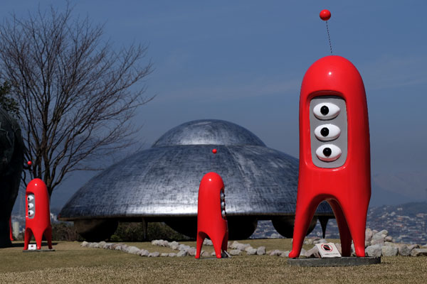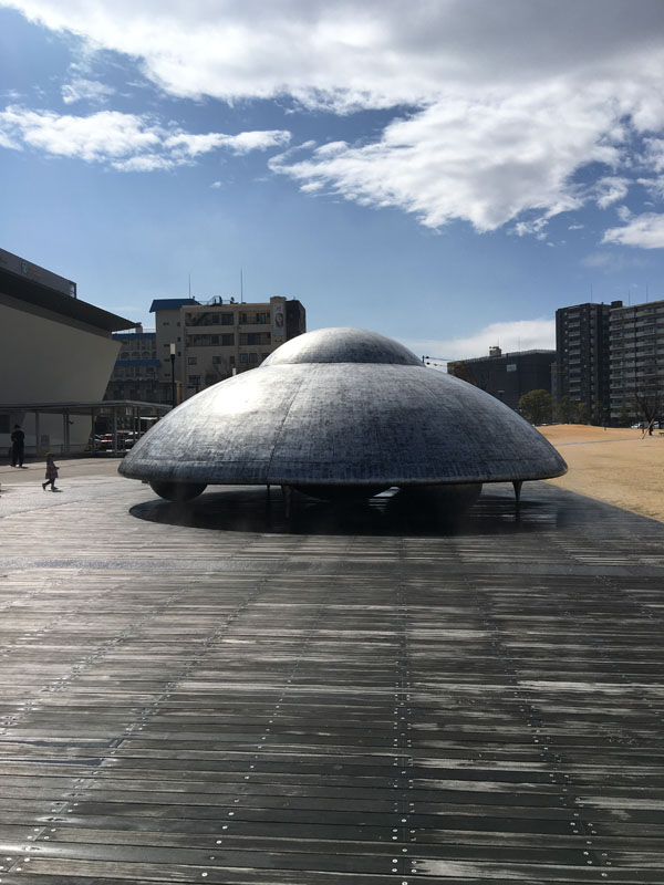 大分駅南口にて展示/素材:ポリエステル、鉄材、純金箔、照明機器、ウレタン塗料 Ship: FRP, height 3.3 x diameter 8.3(m)