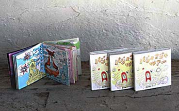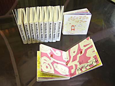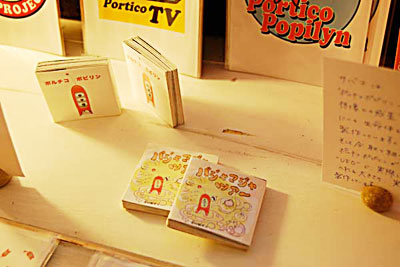マメ本3冊目ができました / 2008 手作りの縦横2インチ(5cm)の豆本です。カ〜ワイイと評判。これで3冊目になった。パジャマジャ星の各エリアの1コマを描いたパジャマジャツアー、いろいろなタイプのポルチコを海に立たせたり、山の頂上に並べてみたりしたポルチコポピリン写真集、そしてこの第3作目(写真)はポルチコがいろんな国を旅行した記念スナップ集です。実はミニミニミニというちっちゃいサイズのポルチコがあってそれをコレクターの方々が旅行に一緒に連れて撮影してくれたスナップ写真集。私の手を離れて世界を旅する光景はなんだか不思議な気分だ。製本は手作りなのでたくさん出来ませんが一冊税込735円にて販売しています。オンラインにても発売。 もちろんあなたの写真もお待ちしてます。左のパジャマジャツアーは9つの地区ツアーのドローイング。右はポルチコポピリンの写真集です。