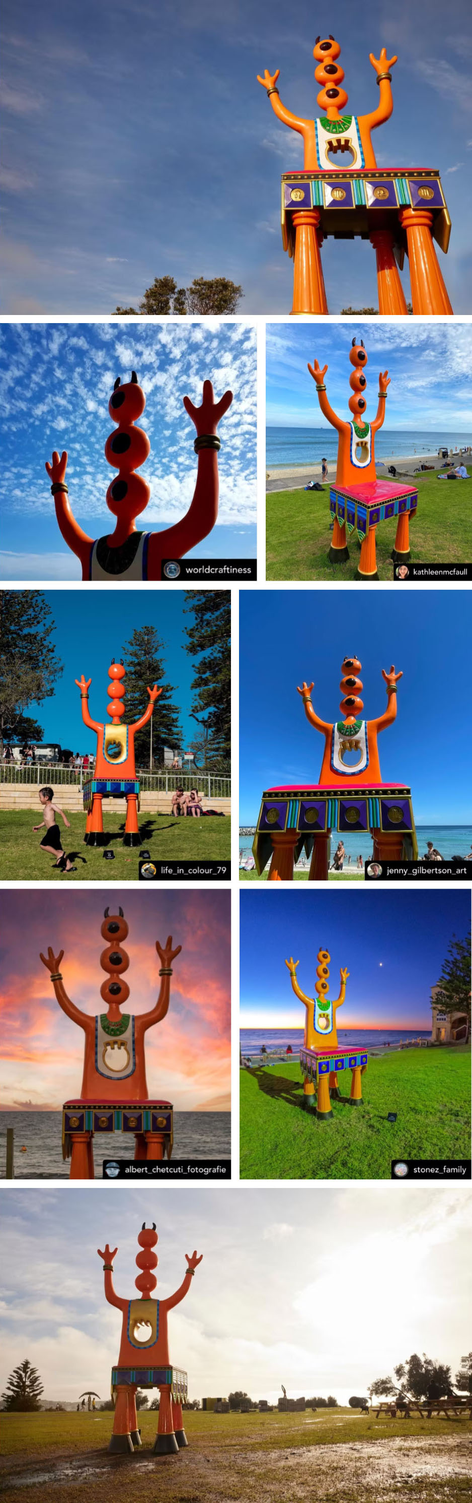 The sculpture's stacked, three-eyed figure embodies both humor and a sense of prophecy, inviting viewers connect with the invisible energies of nature. During the exhibition, it became a landmark piece, photographed widely by visitors against the backdrop of the indian and Pacific Oceans.