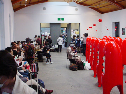 ほとんどが県外からのお客さんで賑わう会期中の一コマ。ギャラリー兼待合室になっている。今回はポルチコ14名様。