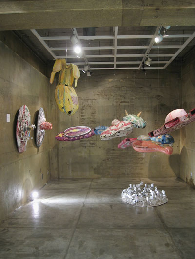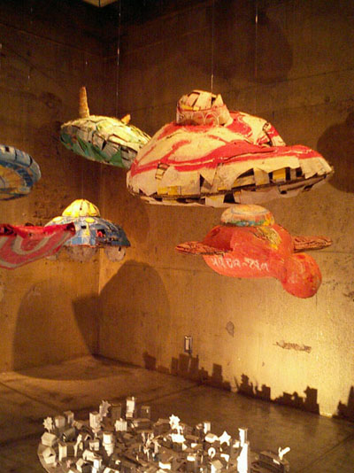 ![]() 展覧会タイトル ”サバコノUFO〜!” 私は変な形のものには条件反射的に反応するけど、なんでもいいってわけじゃない。実際、UFOの目撃情報にもいろんなかたちの目撃証言があるけど、私の中で、これはナシ、これはアリという感覚オンリーの基準がある。--だけど自分の抱いたイメージは当然、すべてが「アリ」だ。だから私はアーティストをしている。少々乱暴な言い方だけど、そーゆーことなんだと思う。 サバコノUFO~! は、9基のUFOと街、すべてダンボールでできている。粘土原型とか、型取りとか、研磨とか、工程が少なく直接的に作れて自由度がきくもの…と考えてのことだ。床には地球上の街を作ってみた。実際じっくり本物を見ないとわからないけど、この街には私の作業場、友達の家、焼き鳥屋、美術館、お好み焼き屋、バーガーショップ、映画館など、自分の理想の住環境が実現している。 ![]() ![]() ![]() ![]() ![]() ![]() ホラー漫画家の御茶漬海苔先生が来てくださいました。 e-mail:savako@dugazig.com |