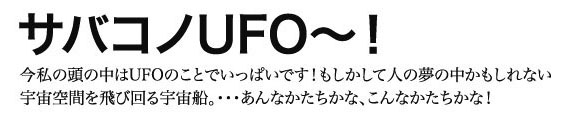 サバコノUFO〜! 3.12-3.17 2007 / Pepper's Gallery / 銀座(東京) 2007年3月12から銀座7丁目ペッパーズギャラリーにてグループ展開催します。 私は今年から実物大の(?)UFOを完成させようというサバコのUFOプロジェクトとして実現に向けて動き出します。今回の銀座での展覧会は、その青写真となるUFOのイメージの数々を展示します。今里淳子さん(今回初顔合わせになります)との二人展です。どんな空間になるのか私自身も楽しみです。 円盤に乗りた〜い! んでもってマジ実物大?UFOを作ろう計画