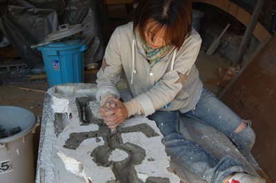 石膏型乾燥中。ダンボールで作った実物大模型と一緒に記念撮影。