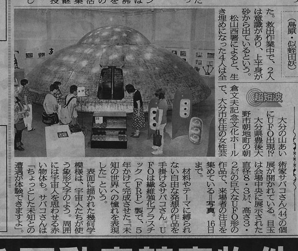 ![]() ![]() ![]() photo by Kenichi Ito ![]() 放送局の方がポルチコに扮装して取材 ![]() ![]() 入船口の様子 ![]() オシロンの周りは12年間の作品や写真パネルが約30コーナーに分類展示 ![]() 動力をイメージした黄金のピラミッド型のオブジェ ![]() 不規則に発光する謎の球体 ![]() 内部にはかなりの人が入れる ![]() UFO設営中の一コマ ![]() 大分合同新聞 ![]() 西日本新聞 ![]() 読売新聞 |