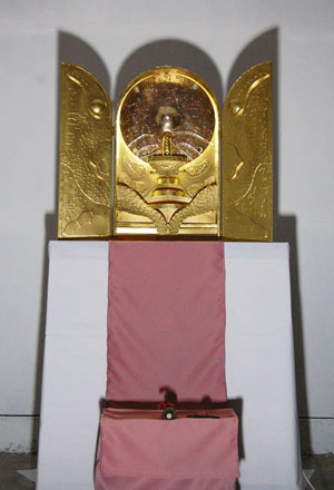 Serial No.238 PY : 2009 H:72cm x W:42cm x D:11cm Material : Tin,Solder,Polyester,Built in Fluorescent light,Gold Paint Type : Unique Nickname : Altar of Portico Popilyn |