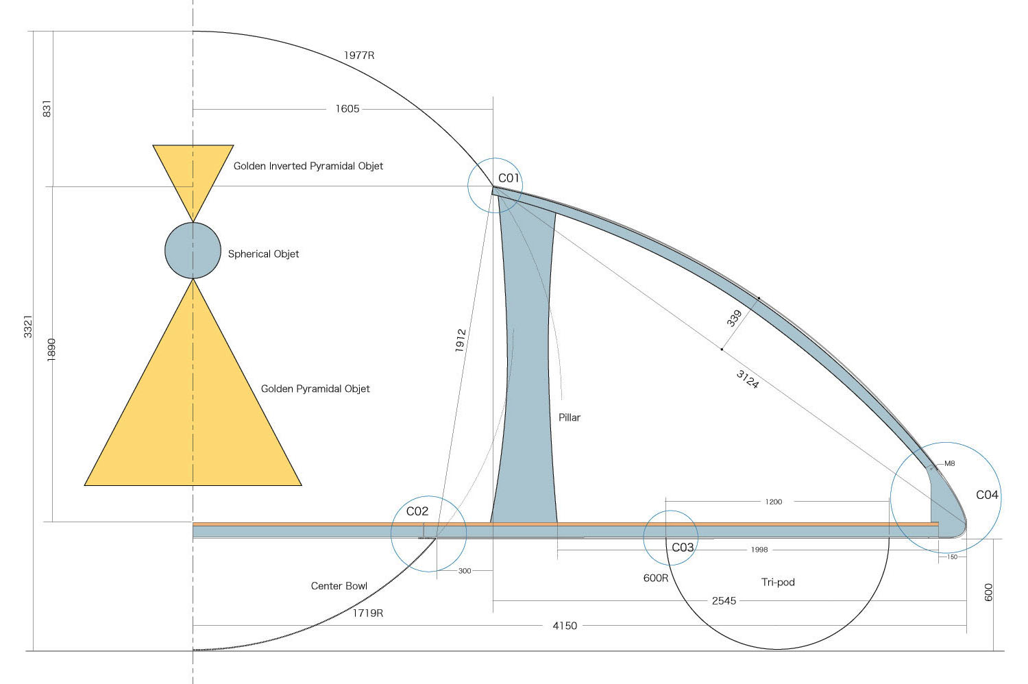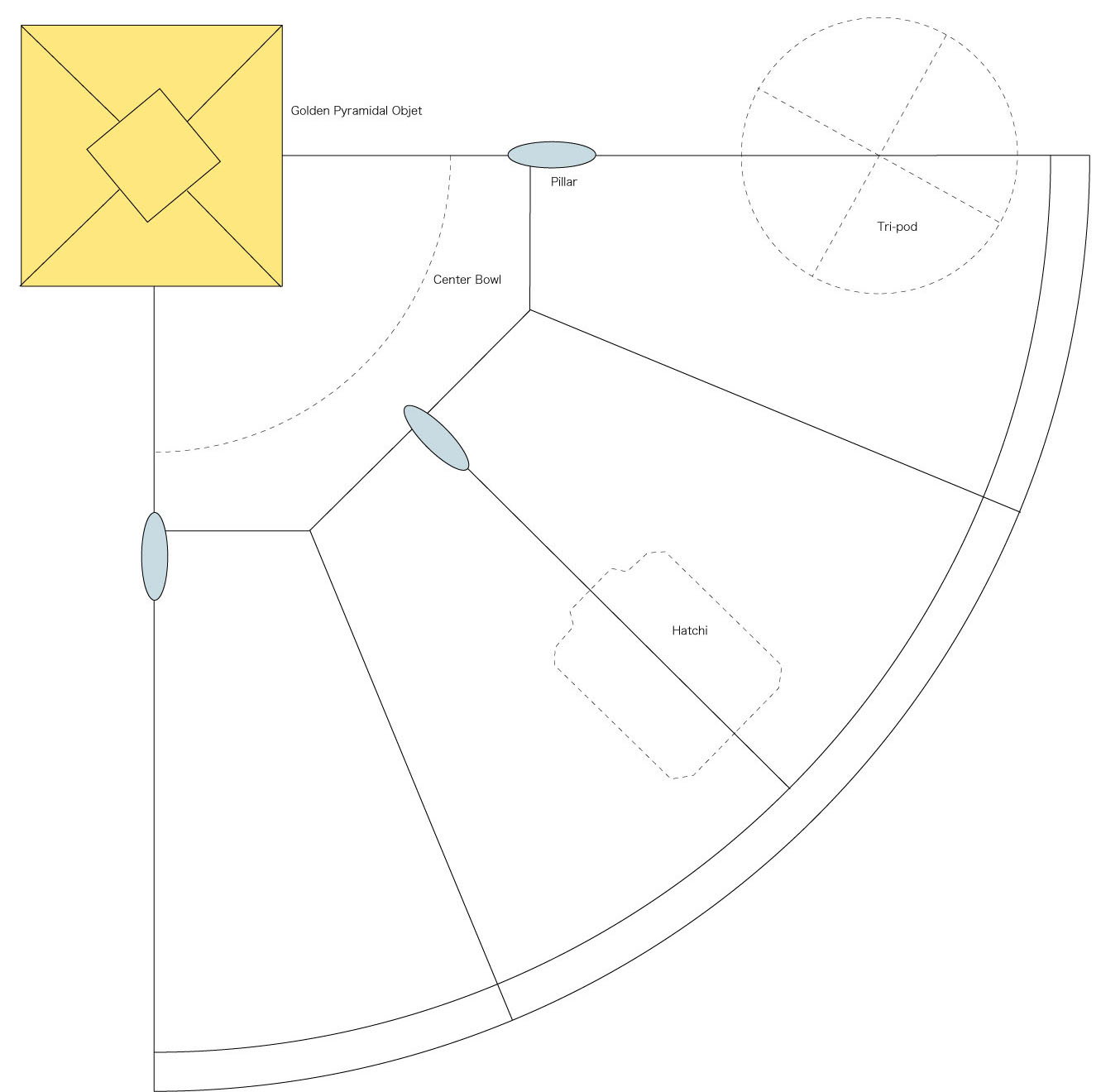 トラックに積載可能で高さ制限もクリアしなければ。組立分解も可能となると接合部はボルト締めフランジも必要。まずは設計図から円形の8分の1ユニットに分けることに。難問をクリアしながらとうとう設計図が完成!このあと挫折とこれほどまでに長い苦労を乗り越え、ほとんどの時間ほぼ二人でやることになるとは想像もしなかった。