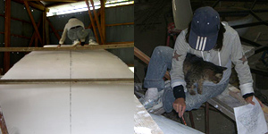 アンダーボウル(下の中央のボウル)1/4の樹脂型。変形を防ぐためのリブ、つなぎ合わせるときに必要なフランジをつける。 両端のフランジは直角じゃないとならないので、片面ずつマットを張って硬化まち。 球体ってむずかしい。