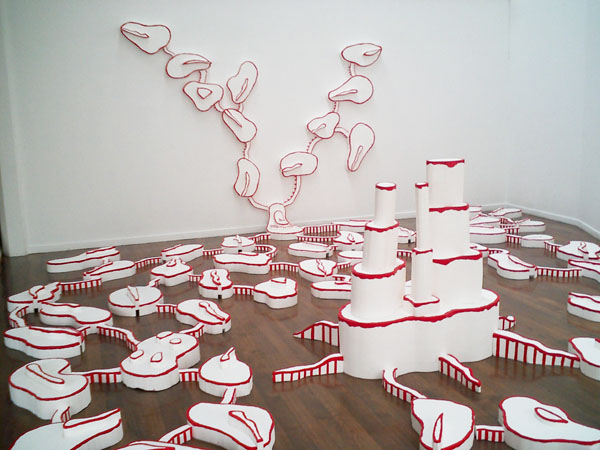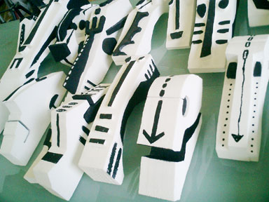 発泡スチロールは加工がしやすくじゃんじゃん作れるので好きな素材の一つだ。 スケッチブックにドローイングするような感覚で手を動かせる。カットした後の 破片から新しいものが生まれたりもする。もう一つ好きな点は、人工物で真っ白 なところ。錆や木片など古びたものも魅力的だけど、時にその風合いの持つ力が 強すぎて、それに惑わされてしまうことがある。その対極でもある発泡スチロー ルは、すんなり私のイメージを受け入れてくれる。