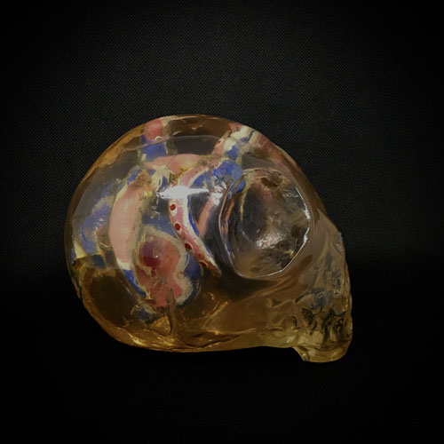 心臓やドクロが入っている。 素材:ポリエステル、アルミニウム、ビロード、シルクスクリーン 13x19x25cm
