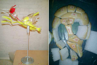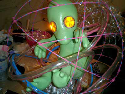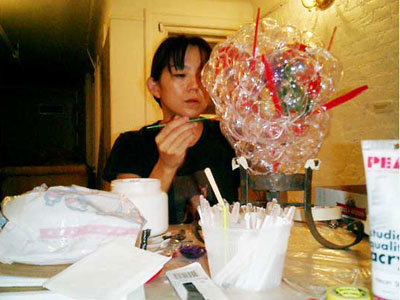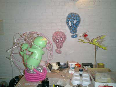 ALIEN BABY / A.I.R 2006 ガーシュインホテル / Artist in Residence N.Y.マンハッタンのガーシュインホテルのレジデンスプログラムに行ってきました。下の写真は不思議な角のような照明が突き出た真っ赤なホテルの正面。2006年に9.6から10.11までの35日間ニューヨークのガーシュインホテルに約1ヶ月間滞在。何度もニューヨークには行っているけれど滞在しながら制作をするのは初めてのことでした。 どうなることかと不安もありましたが行ってしまえば迷うスキがないほど私は夢中になって日々を過ごしていました。 ![]() 2006年に9.6から10.11までの35日間ニューヨークのガーシュインホテルに約1ヶ月間滞在。何度もニューヨークには行っているけれど滞在しながら制作をするのは初めてのことでした。 どうなることかと不安もありましたが行ってしまえば迷うスキがないほど私は夢中になって日々を過ごしていました。 手持ちの道具はほとんど無しに何を作るか。材料費は出してくれる。工 具や画材は地下鉄やバス、徒歩でたいていの物は間に合う。息抜きは美術館などいくらでもある。都市のパワーを体全体に受けて、感性が本当にびりびりと痺れ るように刺激された。そんな強烈な感覚は初めてだった。ナイスな作業部屋を与えられ、気の向く時間に製作すればいい。街を歩いてて透明のプラスチックスプーンがやけに気になりまとめ買いをした。そして作った物のうちの一つは、殻に包まれたエイリアンの胎児。プラスチックに光が当たるとキラキラきれいだ。 内面的には体験したことがないほどエキサイトしていたようです。すべてがフレッシュに感じました。 アーチスト イン レジデンス (A.I.R.)というプログラムは欧米ではポピュラーなもので、最近では日本でも何カ所かで行われているようですが、そのスタイルはA.I.R.によって様々のようです。 だからほかの作家がどのような感想を持っているのかは知りませんが、少なくとも私にとって今回のA.I.R.はぴったりのものだったと思います。 マンハッタンという大好きな都会のほぼど真ん中でホテルに滞在しながら製作できるだなんて、一大事件だったわけです。 少々のトラブルなども困るのだけれど面白いと感じたりして、さほど落ち込むこともなく、そこでは意外とタフな自分に驚いたりもしました。 作品はニューヨークについてから考えました。その地にいた自分だからこそできた表現だったと思っています。 このホテルにはアートがいっぱい飾られていた。 これも誰かの作品。ポップアートがメイン。 フロントには日系のアヤさんがいてくれて大助かり。 ![]() アーティスト・イン・レジデンス初日。 個室の部屋から毎日眺めていた外の景色。 用意してくれた私のスタジオ。けっこう広い。 ![]() 使っていない会議室が私のスタジオ。 ![]() これでも整理整頓してる。 ![]() 近くのホームセンターで材料仕入れ。これ何だろう?? ![]() 制作途中、右が設計図? ![]() とにかくスプーンが気になっていた。 ![]() 製作中のエイリアンベイビー。 ![]() 色を変えたらどうだろう。 ![]() 卵の中に入ってゆく。 ![]() ![]() ![]() ![]() 短期間で頑張りました。 ![]() 生け贄の心臓をイメージ。プラスチックスプーンを使用。 ![]() 暗闇にエイリアンベイビーの卵が光る。 ![]() ![]() スタジオでの制作の1コマ。 こんな広告見たのは初めて。 セント・ヨハネ大聖堂にあるキース・ヘリングの祭壇。 道路にマーキング。こんなのでわかるのかな? アイロンだ! ![]() 映画(I am legend)の撮影をしていた。 ![]() 消防車もカラフル。さすがアメリカ。 全面ガラスのアップルストア。地下が売り場になっている。 友人に紹介してもらった造形作家マイクのアパートメント。 ニュージャージーにあるマイクのスタジオ。いい仕事してます。 ![]() 最後にはロビーでSHOWが実現! ![]() 作品名"LOVERS" ![]() 作品名"MASK" 作品名"HEART" 作品名"LOVELY BABY" |