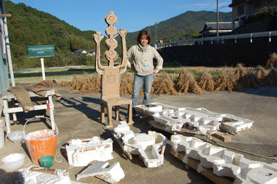 石膏型乾燥中。ダンボールで作った実物大模型と一緒に記念撮影。