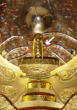 Serial No.238 PY : 2009 H:72cm x W:42cm x D:11cm Material : Tin,Solder,Polyester,Built in Fluorescent light,Gold Paint Type : Unique Nickname : Altar of Portico Popilyn |
